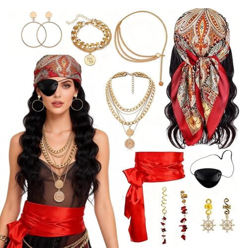 10 st piratkostym tillbehörsset för kvinnor, pirat rollspel outfit med huvudduk midjebälte halsband armband ögonmask örhängen för halloweenfest, maskerad, scenframträdande, piratfest