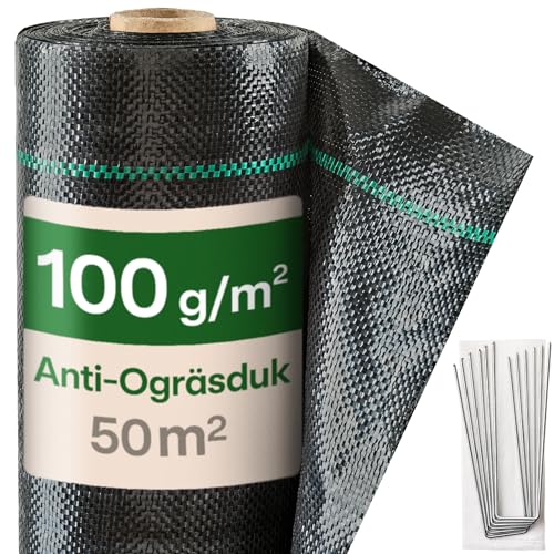Praknu Ogräsduk 100g - med 24 Markankare Rostskyddat Stål - 1m x 50m Ogräsbekämpningsmatta - Vattentåligt & Kraftigt