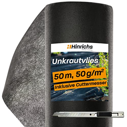 Hinrichs Ogräsfleece 50m - Trädgårdsfleece mot Ogräs - Ogräsfilm för Trädgård 50g/m² - Mulchfleece - Trädgårdsduk Vattengenomsläpplig - Skydd mot Sorkar - Ogräsduk - Ogrässkyddsfilm