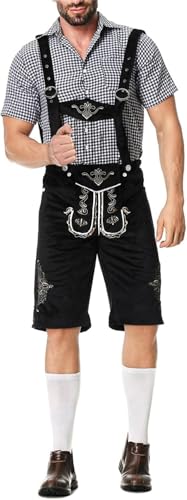 Fasheepfa Lederhosen Kostym set för män kostym set män Oktoberfest outfit komplett traditionell skjorta rutig skjorta hängselbyxor bayersk utklädning (svart 1, XL)
