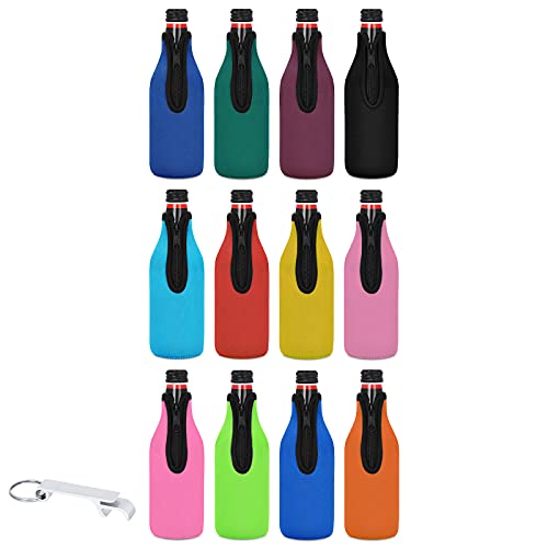 12-pack ölflaska kylhylsor håll drycken kall dragkedja extra tjock neopren isolerad ärmskydd med flasköppnare (12-pack, multi)