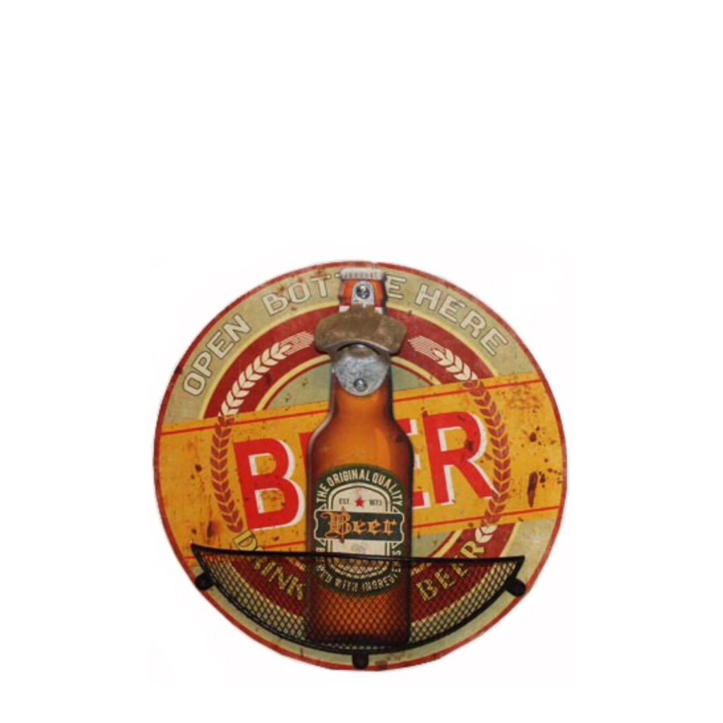 Väggmonterad kapsylöppnare med metallkorg - ölflaska