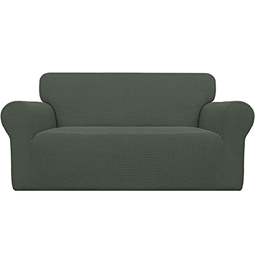 Lättgående stretch loveseat överdrag 1-del sofföverdrag möbelskydd soffa mjuk med elastisk botten för barn polyester spandex jacquardtyg små rutor (divan, olivgrön)