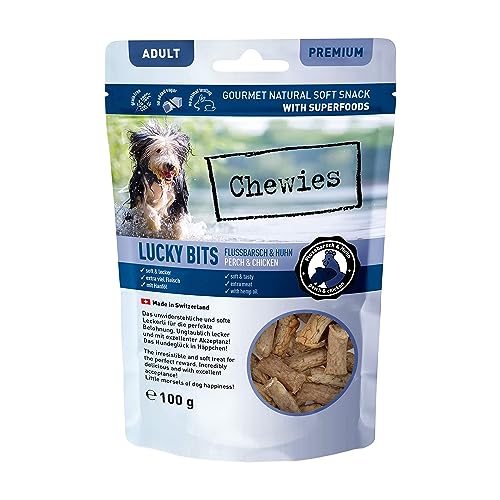 Chewies Lucky Bits flodabborre & kyckling vuxen hundgodis – hundgodis spannmålsfri & mjuk med massor av protein och supermat som öljäst eller ginkgo, utan socker (100 g)