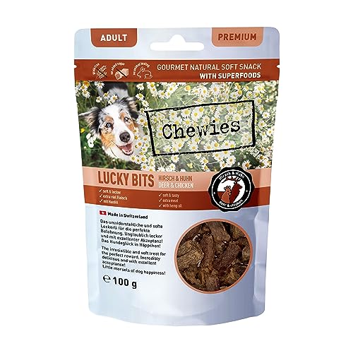 Chewies Lucky Bits hjort & kyckling vuxen hundgodis – hundgodis spannmålsfri & mjuk med massor av protein och supermat som öljäst eller ginkgo, utan socker (100 g)
