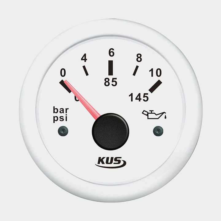 Oljetrycksmätare KUS, imfri, Ø52 mm, 12 V / 24 V, 10 - 184 Ω, vit, 0 - 10 bar / 0 - 145 psi