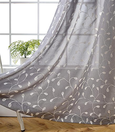MIUCO blommigt broderi halvgenomskinliga gardiner falskt linne öljettgardiner för sovrum 132 x 153 cm 2 paneler, grå