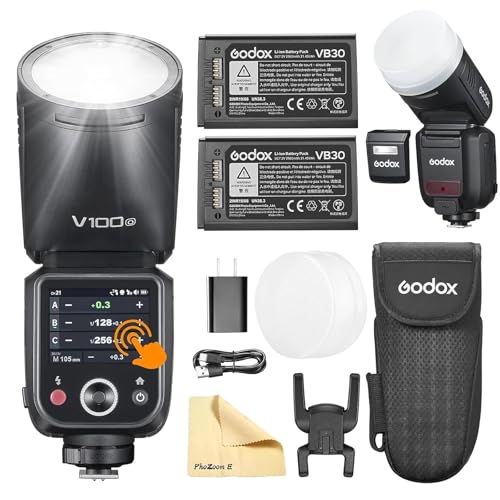 Godox V100-O V100 O Round Head Camera Flash-blixt med 2 x GODOX VB30 2,4G trådlös TTL Speedlight Strobe, 100 Ws HSS 1/8 000s med Li-Ion-batteri för Olympus Panasonic-kameror