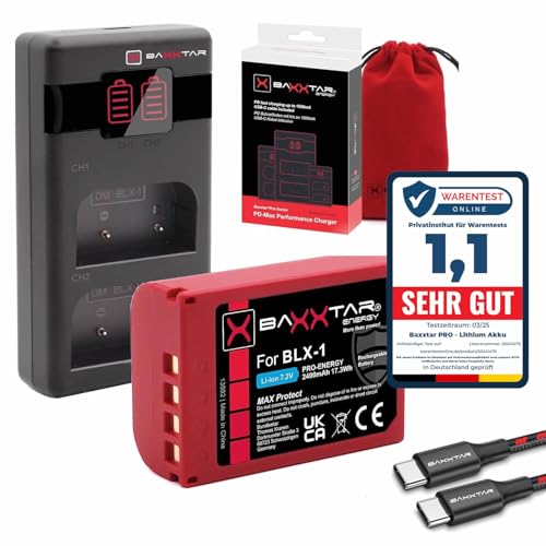 Baxxtar MaxProtect BLX-1 2400 mAh batteri för OM-1 med NTC-sensor och skyddshölje klass V1 - laddning med PD-Performance USB 161713 (1500 mA)