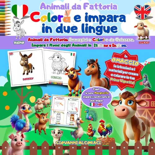 Colora e Impara in Due Lingue: Animali da Fattoria.: Immagini a colori e da colorare. Impara i nomi degli animali in italiano e inglese. Omaggio: materiale e istruzioni per una vignetta.