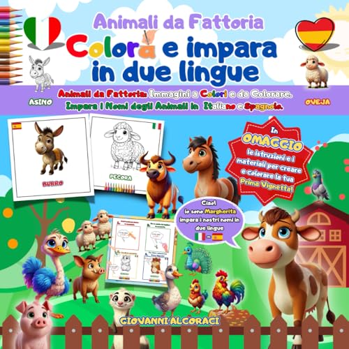 Colora e Impara in Due Lingue, Animali da Fattoria: Immagini a colori e da colorare. Impara i nomi degli animali in ITALIANO e SPAGNOLO. Omaggio: materiale e istruzioni per una vignetta.