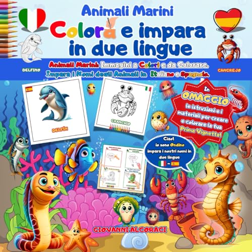 Colora e Impara in Due Lingue: Animali Marini.: Immagini a colori e da colorare. Impara i nomi degli animali in italiano e inglese. Omaggio: materiale e istruzioni per una vignetta.