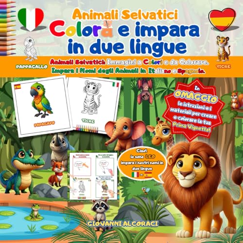 Colora e Impara in Due Lingue, Animali Selvatici:: Immagini a colori e da colorare. Impara i nomi degli animali in ITALIANO E SPAGNOLO. Omaggio: materiale e istruzioni per una vignetta.