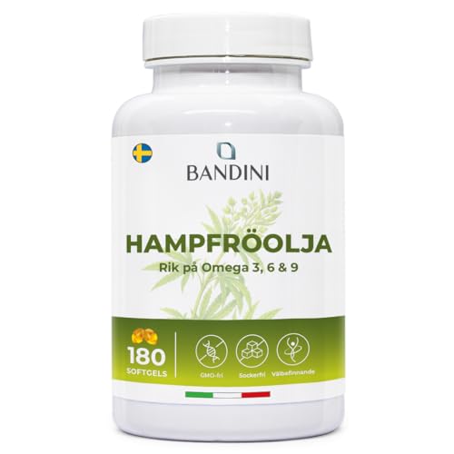 Bandini® hampfröolja 1000 mg softgels | 180 kallpressade veganska kapslar | 6 månaders förbrukning | 1 dagligen | hampolja rika på till omega 3, 6 och 9 | ALA, linolsyra och oljesyra | Hemp Seed Oil