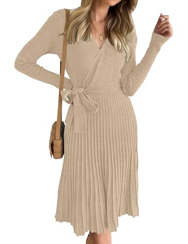 ZESICA Dam 2024 höst långärmad omlott v-ringad ribbstickad veckad en linje pullover tröja klänning med bälte, havregryn, S