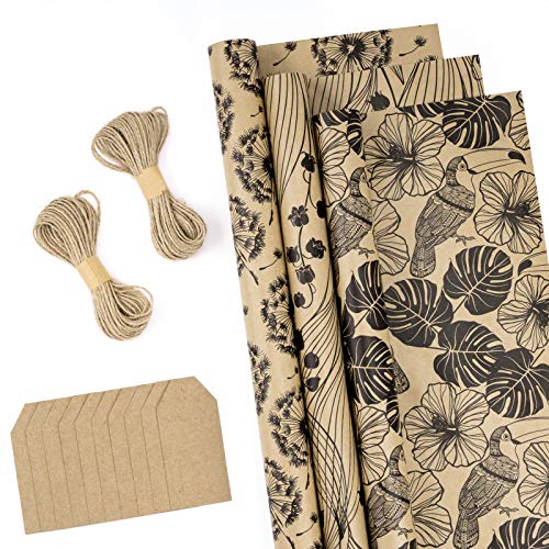 RUSPEPA Omslagspapper rullar med etiketter, jutesträng - 43 cm x 3 meter per rulle, totalt 3 rullar, blommor svart