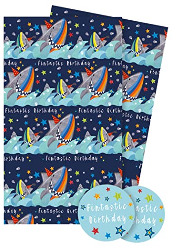 Omslagspapper 12621A födelsedagshajar presentinslagningspaket med 2 ark och 2 etiketter, plastfri och helt återvinningsbar, flerfärgad