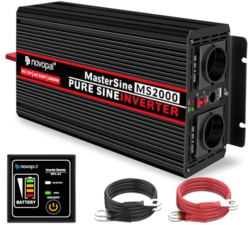 NOVOPAL 2 000 W Ren sinus-spänningsomvandlare – bilväxelriktare 12 V till 230 V omvandlare – växelriktare med 2 EU-uttag och USB-port – inkl. 5 meter fjärrkontroll – toppeffekt 4 000 watt