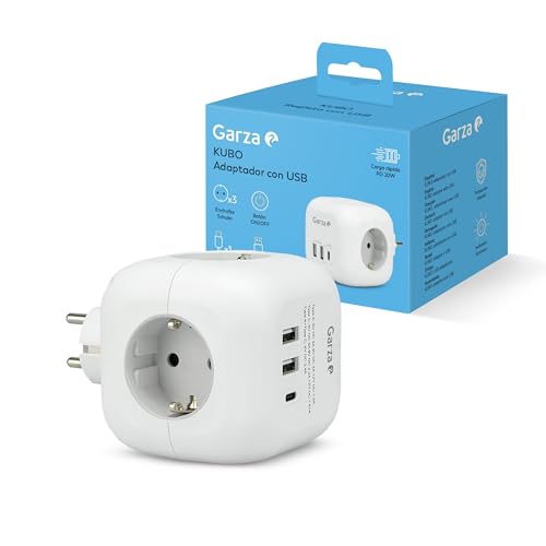Garza - 6-i-1 Kubo-adapter med 3 Schuko-uttag, 2 USB-A och 1 USB-C PD20W, QC3.0 snabbladdning, ON/Off-knapp, kompakt låsningsfri design och modern stil