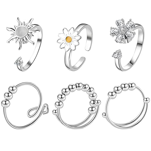 JewelryWe Ångestringar för kvinnor, 4/6/7 st öppna ringar, justerbar fidgetring, stresslindringsringar med onda ögat, solros, fjäril, oändlighet, pärlringar set, Kubisk zirkonia