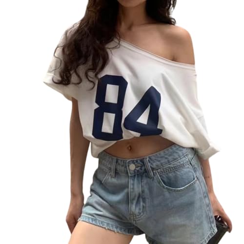 One Shoulder Oversized t-shirts kortärmad Y2k baby t-shirts sommar crop top jersey off shouder graphic tee damer, Vit/överflödig trädgård, En Storlek