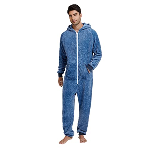 OBiQuzz Overall pyjamas herr jumpsuit, pyjamas one piece dräkt fleece onesie fluffig pyjamas varm fleece overall långärmad onepiece huvtröjor hemmadräkt jumpsuit sparkdräkt, blå, XXL