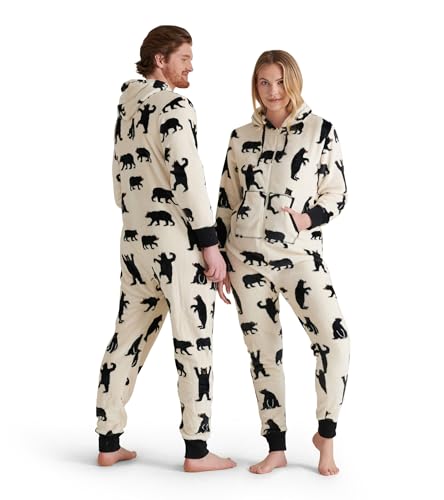 Hatley Fuzzy fleece med huva, svart björn, familj, jumpuits onesie, Vit (vuxen jumpsuit – Black Bears On Natural), M