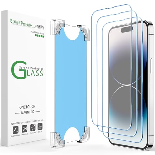 amFilm 3-pack magnetisk OneTouch kompatibel med iPhone 14 Pro Max 6,7 tum skärmskydd härdat glas kant till kant full täckning med enkel installationssats (magnetisk och återanvändbar)