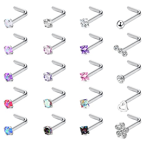 Adramata 20 stycken 20 g nostril piercing rostfritt stål näspiercing plugg set diamant opal CZ näspiercing smycken för kvinnor män skruv/rak/L-formad näsbult flerfärgad, Zirkonia, diamant, opal