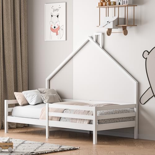 jeerbly Barnsäng 90 x 200 cm, enkelsäng, vitlackerad enkelramssäng med öppen spis, för ditt barns sovrum, ribbotten