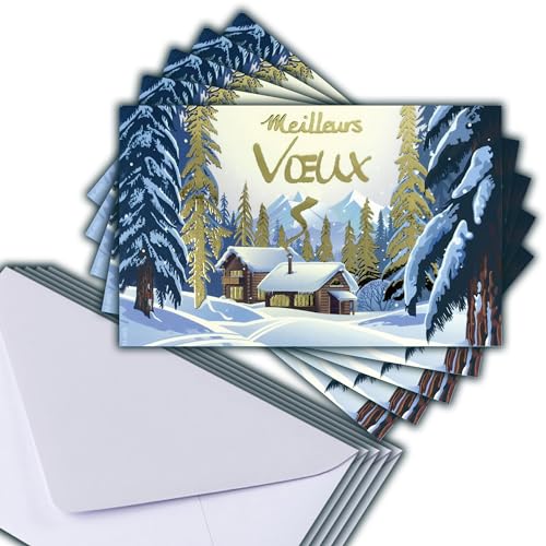 Set 5 bästa hälsningskort i glänsande guld + 5 vita kuvert format 14 x 9 cm - stuga under snön öppen spis, julgranar, skog, berg, snöiga toppar, vinterlandskap, slutet av året