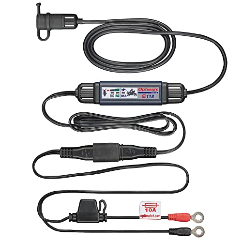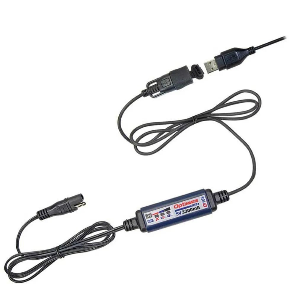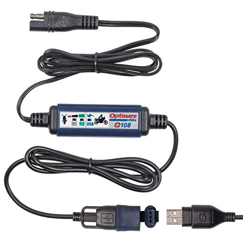 TecMate OptiMATE USB O-102, 1 000 mA USB-laddare med automatisk avstängning för att skydda batteriet, väderbeständig, SAE, på- och utgångskabel.