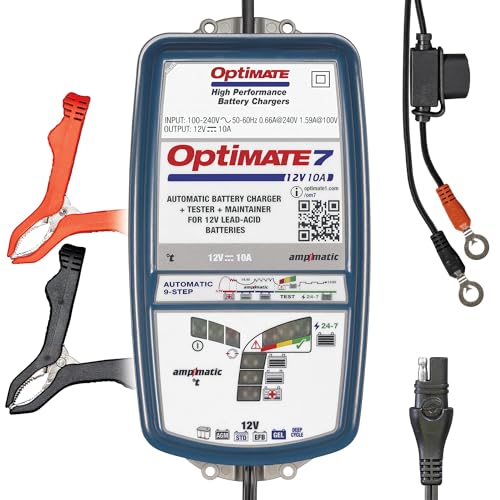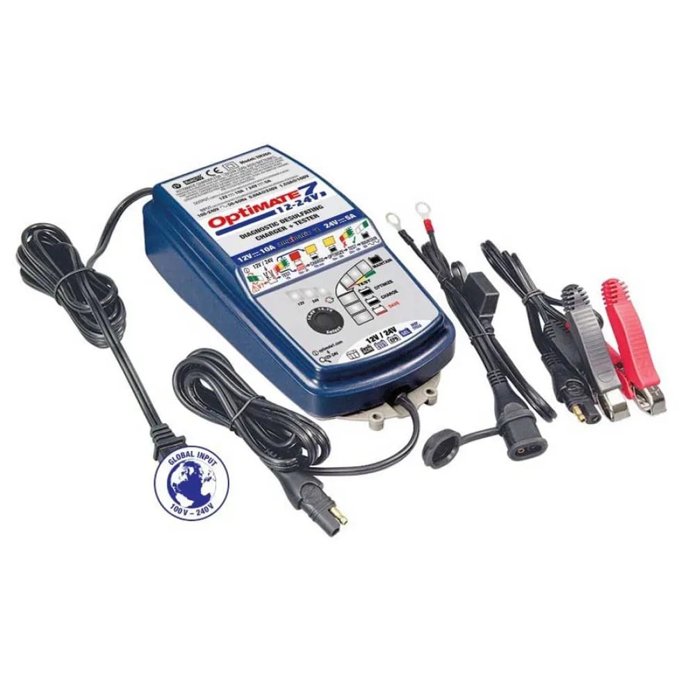 TecMate OptiMate 7 12 V/24 V, TM260, 8-stegs inkapslat batterisparande 12 V 10 A/24 V 5 A laddare och underhållsenhet, blå