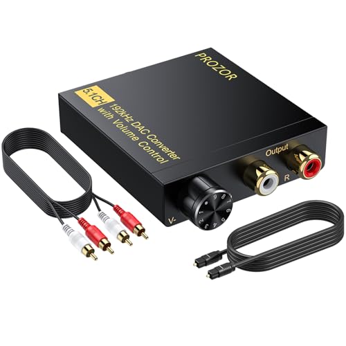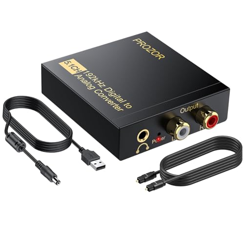 PROZOR 5.1CH DAC-omvandlare – optisk/koaxial till RCA/3,5 mm, 192 Khz digital till analog ljudadapter med förstärkarchip, inkluderar 1,0 m optisk kabel och magnetisk ringströmsladd