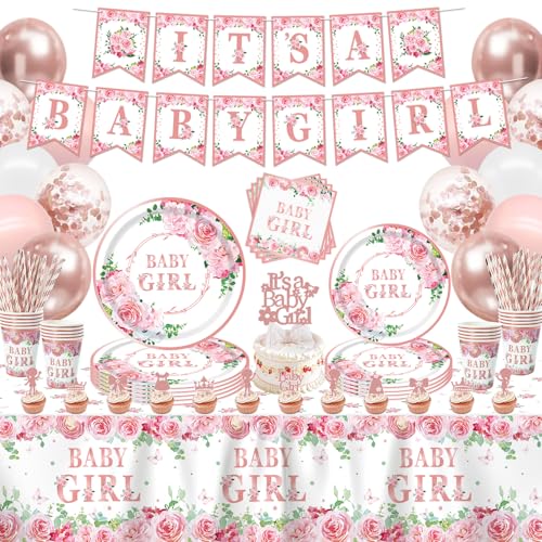 168 ST Baby shower-dekorationer för tjej med könsupptäckande festtillbehör Babygirl-servis - tallrik, servetter, baby shower-banner Rose Gold Floral (BabyGirl-B)
