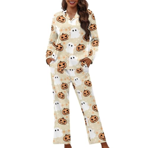 STUOARTE Dam 2-delad pyjamasset, långärmade nattkläder med långa byxor button down nattkläder halloween myskläder, Orange och vit – spökpumpa, M