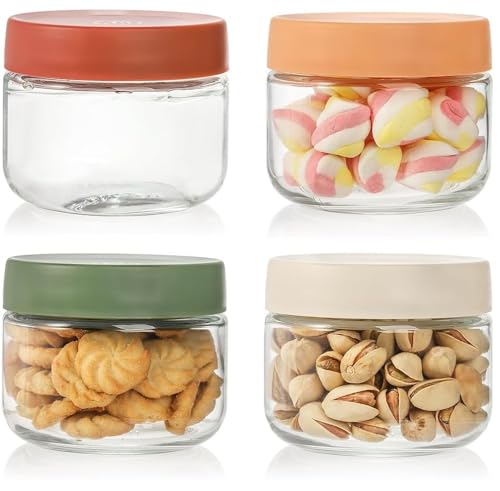 KAHEIGN 4 st havreburkar, 300 ml breda munglasburkar över natten havre glasburkar behållare med läckagesäkert skruvlock för matförvaring, torrmat, mellanmål, godis, bönor (4 färger)