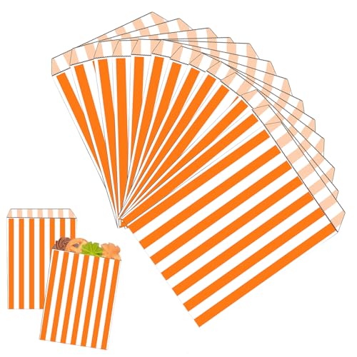 100 orange randiga papperspåsar, 12 x 18 cm, presentpapperspåsar, choklad, godis och kakor för barn, pommes och delikat, fett till julfesten och födelsedagar.