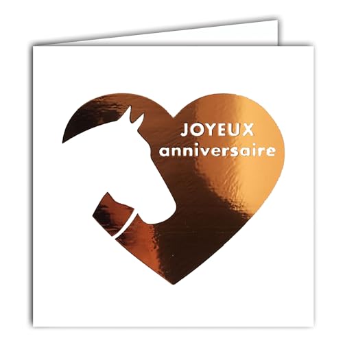 22218 Kvadratiskt lyckligt födelsedagskort hästhuvud på hjärta koppar orange glänsande - med vitt kuvert 15 x 15 cm - fransk tryckt skapelse - dröm ordkollektion