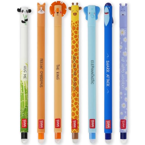 LEGAMI - Uppsättning av 7 raderbara gelpennor med termokänsligt raderingsbläck, utbud av bläckfärger och cylinderdesign, 0,7 mm spets, Panda, Corgi, lejon, giraff, elefant, haj, flodhäst design