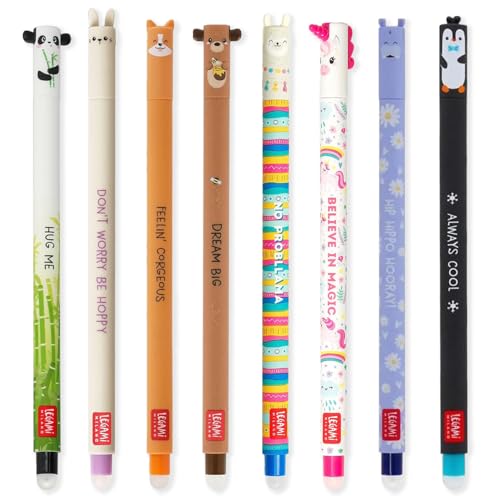 LEGAMI - Uppsättning av 8 raderbara gelpennor med termokänsligt raderingsbläck, utbud av bläckfärger och cylinderdesign, 0,7 mm spets, panda, kanin, corgi, teddy, lama, enhörning, flodhäst