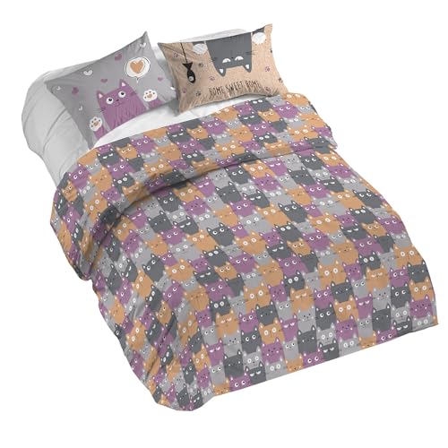 PENSIERI DELICATI Påslakanset för dubbelsäng 100% bomull, komplett med säck 250 x 200 cm och 2 örngott 52 x 82 cm, tillverkad i Italien, maskintvättbart påslakan i 40°, Happycat orange mönster