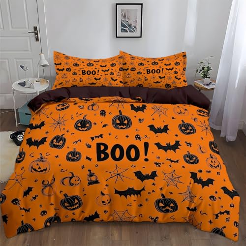 Orange lättskött tryckt påslakanset king, mystisk halloween spöke pumpa borstad mikrofiber påslakan – 230 × 220 cm ultramjukt täckesskydd med dragkedja