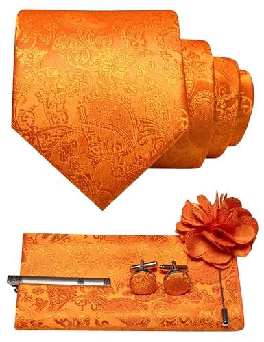 JEMYGINS Paisley-slips för män med näsduk slipsklämma blombrosch och manschettknappar set, Orange färg, M