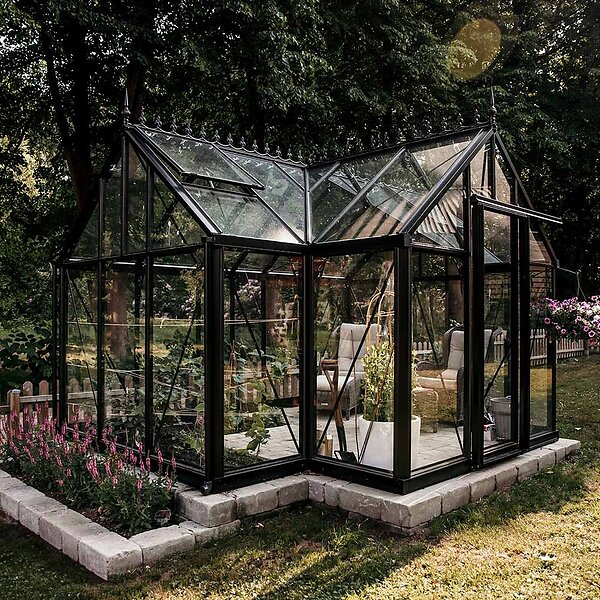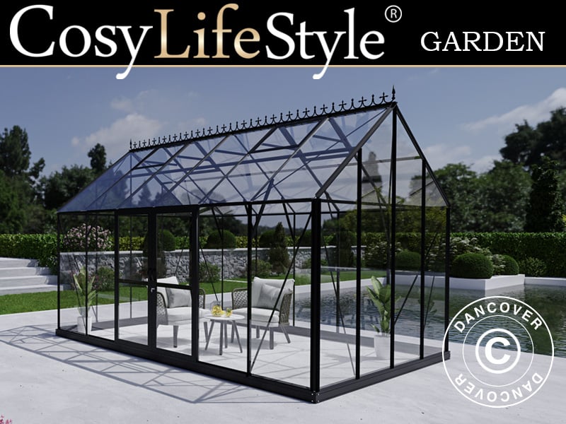 Orangeri, växthus i glas 13,8m², 3,73x3,71x3,16m m/botten och takdekoration, Svart