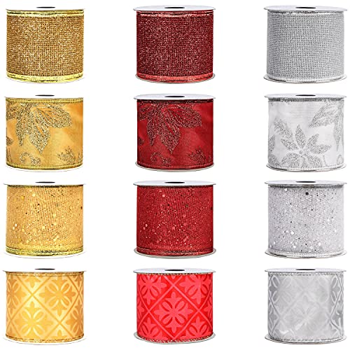 Belle Vous julband (12-pack) – 2,74 m x 63 mm brett trådbundet guld silver rött organza-band i blandade mönster – dekorativa julgransband för jul julgransdekoration bågar presentinslagning