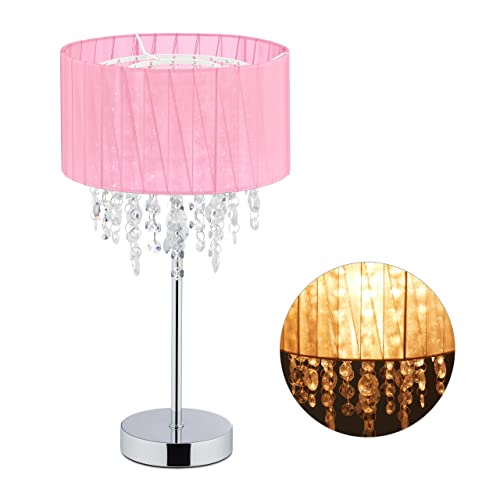 Relaxdays Bord kristall, lampskärm av organza, runt stativ, sänglampa, H x D 41 x 14,5 cm, rosa/silver
