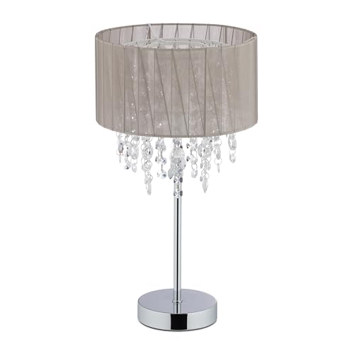 Relaxdays Bord kristall, lampskärm av organza, runt stativ, sänglampa, H x D 41 x 14,5 cm, grå/silver