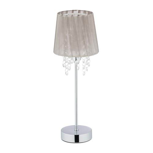 Relaxdays Bord kristall, lampskärm av organza, runt stativ, sänglampa, H x D: 43 x 24 cm, grå/silver