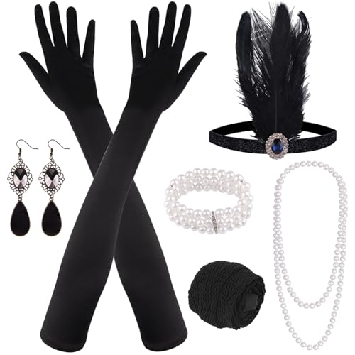 FEPITO Set med accessoarer, 1920-tal, 10 delar, pannband med fjädrar, Great Gatsby-tillbehör, glada tjugotalet, pannband, huvudbonad, långa svarta handskar, halsband, örhängen för kvinnor (svart)